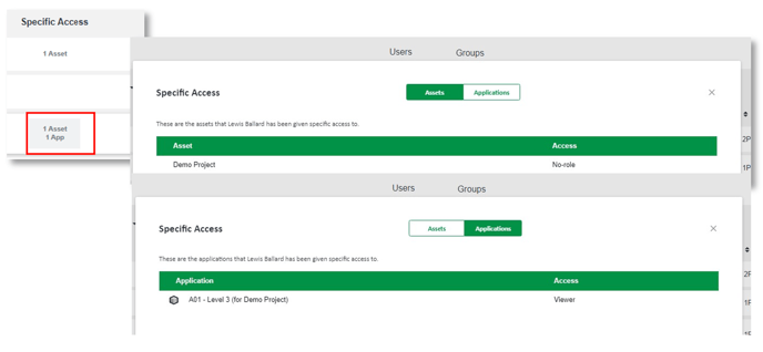 Click on the Specific Access column to see the Assets and Applications view page. Toggle between Assets and application by clicking on either Assets or Applications.